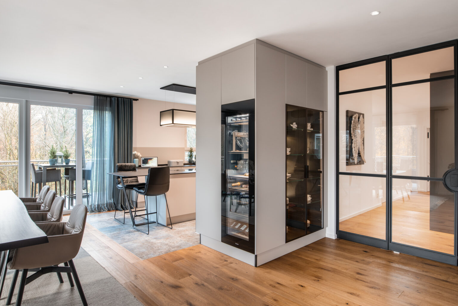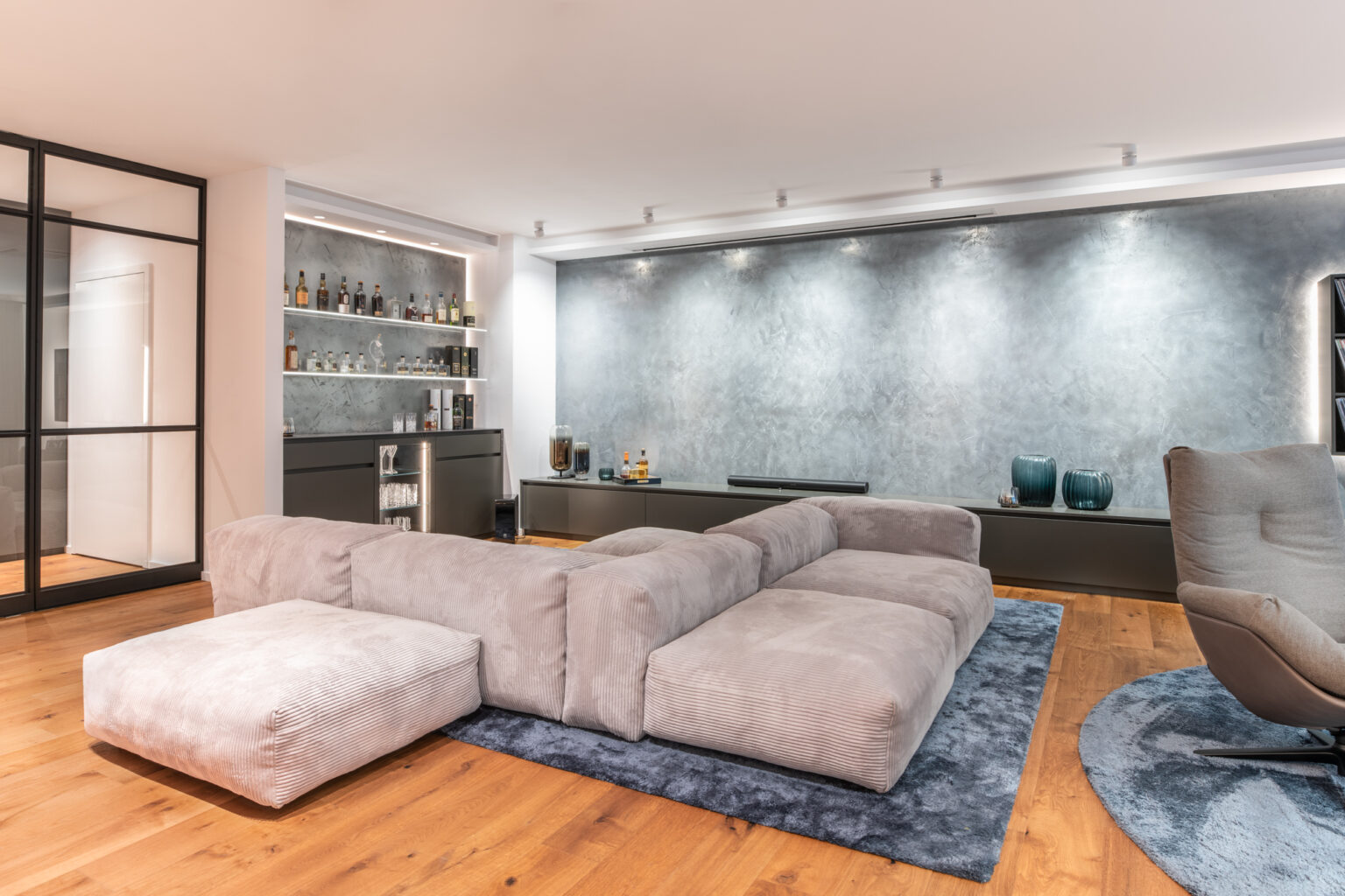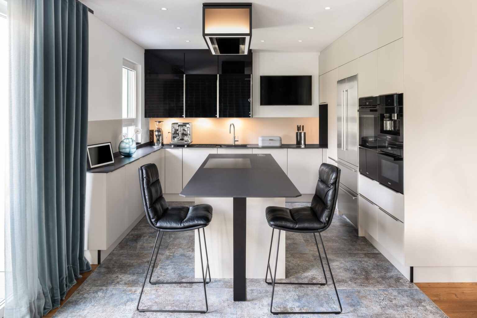 Lichtdurchflutete Penthousewohnung in einem Neubau mit individuell gestaltetem und elegantem Design. Ein fein aufeinander abgestimmtes Licht-, Farb- und Materialkonzept sowie die Anfertigung der individuellen Möbel erzeugen eine moderne Behaglichkeit.